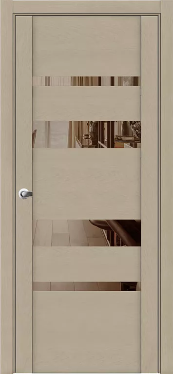 Глухое полотно двери разбавлено стеклянными вставками по всей высоте. Завершенный образ модели придают ровные, не рельефные наличники и выполненная в едином стиле фурнитура.