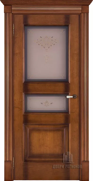 Элегантный внешний вид двери цвета орех со вставками из закаленного стекла дополнит интерьер в классическом стиле, а так же в стиле нео-классика. Особый шарм двери Терзо Кристалл добавляет узор, выполненный в технике фьюзинг, а также необычное оформление дверной коробки капителями.