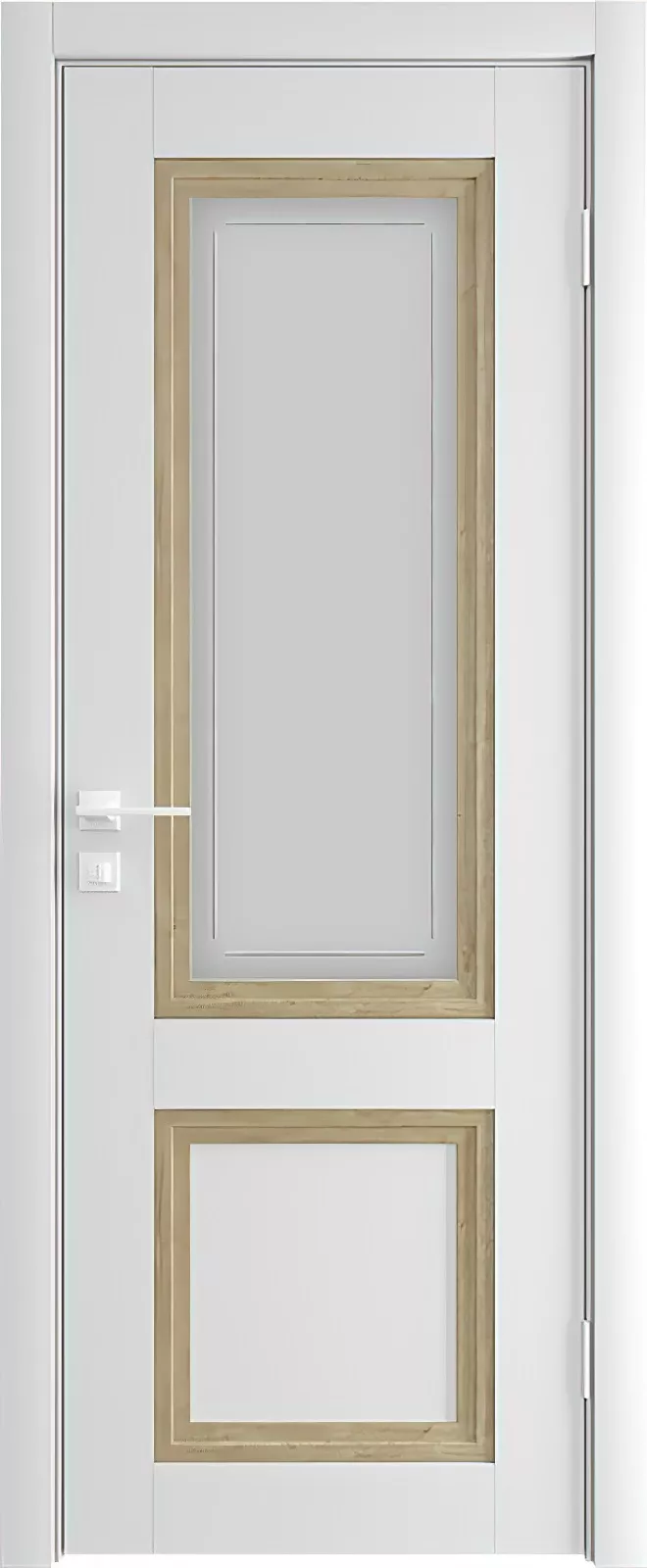 Древесная рама окантовывает филенки и стекла по периметру, подчеркивая геометрию двери. Светлый сатинат с гравировкой отлично дополняет остекленные модели, которые выступают компаньонами глухих дверей и подойдут для установки в гостиную или на кухне, привнося в помещение больше света.