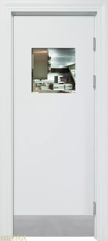 Барные двери актуальны в помещениях с повышенной проходимостью для более удобного доступа персонала к техническим комнатам, например с бара в зону кухни. Часто бывает необходимым, для обзора соседнего помещения, чтобы дверь была остекленная и стилистически оформлена. Стекло толщиной 4 мм круглой, овальной или квадратной формы, на выбор: сатинат светлый, бронзовый, графит или прозрачное стекло. Устанавливается на двери толщиной 40 мм в покрытии Эмаль (любой цвет по RALу) и толщиной 35 мм в ПВХ-покрытиях.