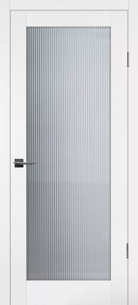 Царговое полотно, выполненное в гладком матовом покрытии, приятным на ощупь, обладающее высокими эксплуатационными характеристиками. Бескромочная технология.###-line-###Полотно комплектуется объемной филенкой с фрезерованным рисунком под рейку . В остекленных полотнах используется рифленное стекло с красивым прокатным узором в виде полос. Отлично смотрится в неоклассических и лофтовых интерьерах.